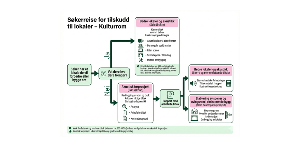 Merk: Kulturrom gir ikke tilskudd til salsbelysning, universell utforming eller oppgradering av ventilasjonsanlegg, men dette kan inngå i totalbudsjettet.